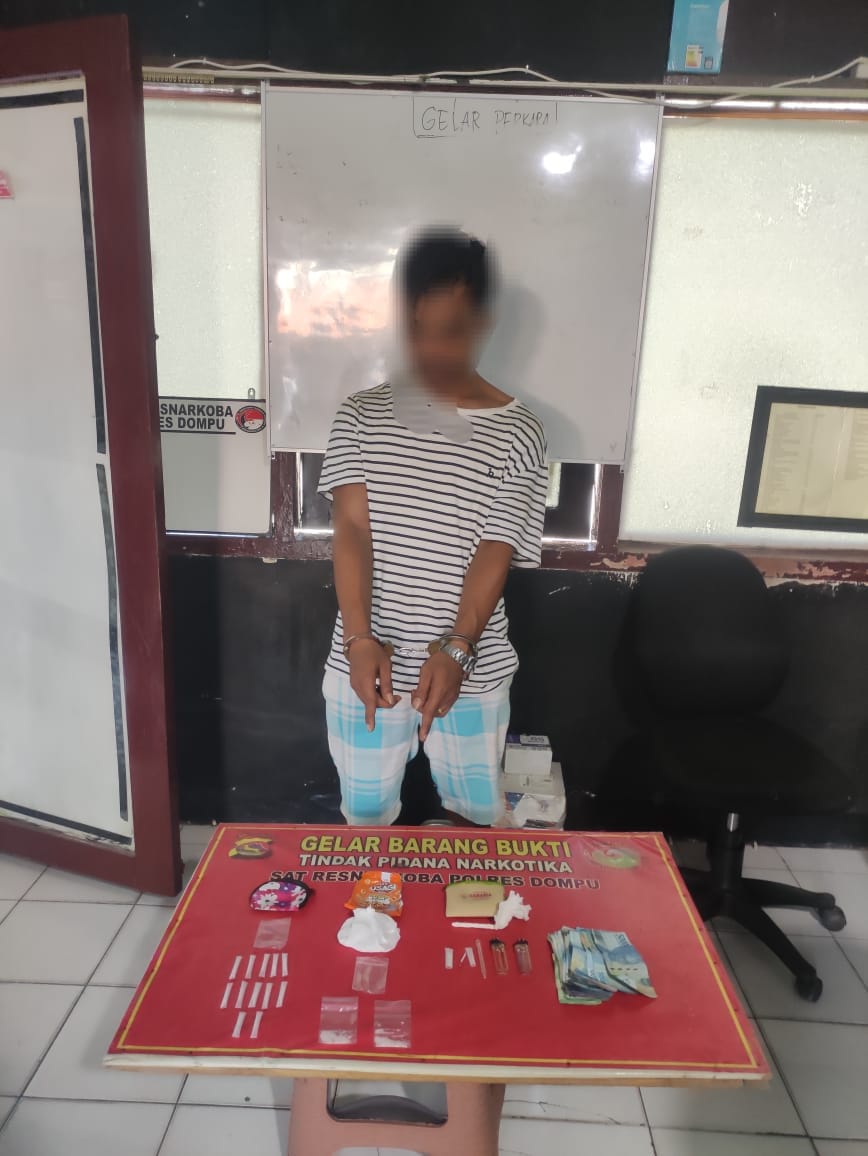 Tim Opsnal Satresnarkoba Polres Dompu menangkap seorang pria berinisial J (28), warga Lingkungan Bali Barat, Kelurahan Bali, Kecamatan Dompu, atas dugaan kepemilikan dan peredaran narkotika jenis sabu.