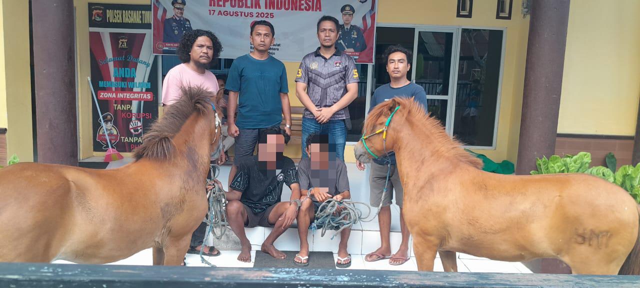 “Keduanya diamankan di tempat kos mereka, dan dari hasil penggeledahan ditemukan barang bukti berupa dua ekor kuda betina hasil curian,” jelas Iptu Suhadak.