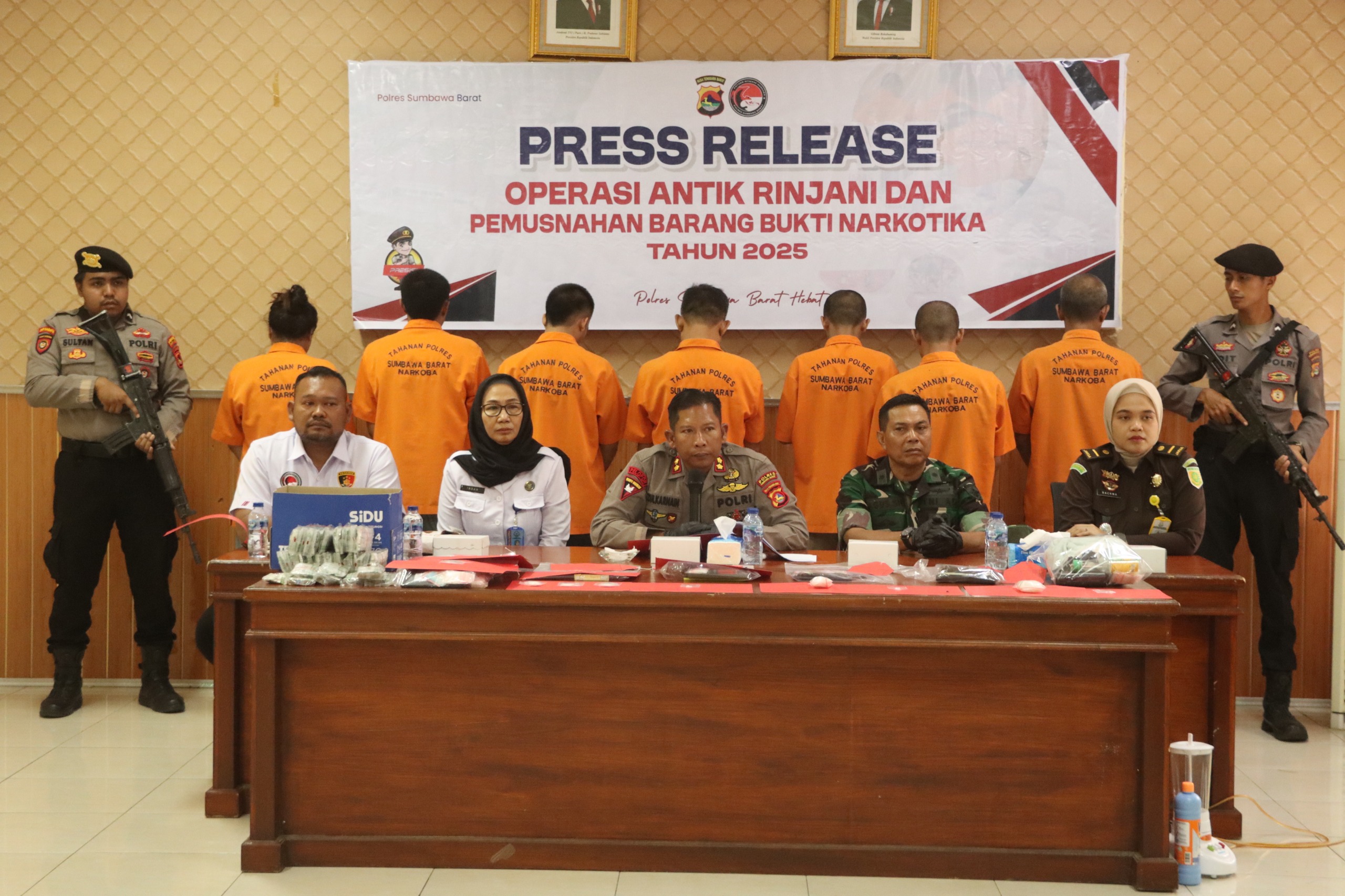 Sumbawa Barat – Kepolisian Resor (Polres) Sumbawa Barat menggelar Press Release Hasil Operasi Antik Rinjani dan Pemusnahan Barang Bukti Narkotika Tahun 2025, bertempat di Aula Endra Dharmalaksana Polres Sumbawa Barat, Selasa (15/12/2025).