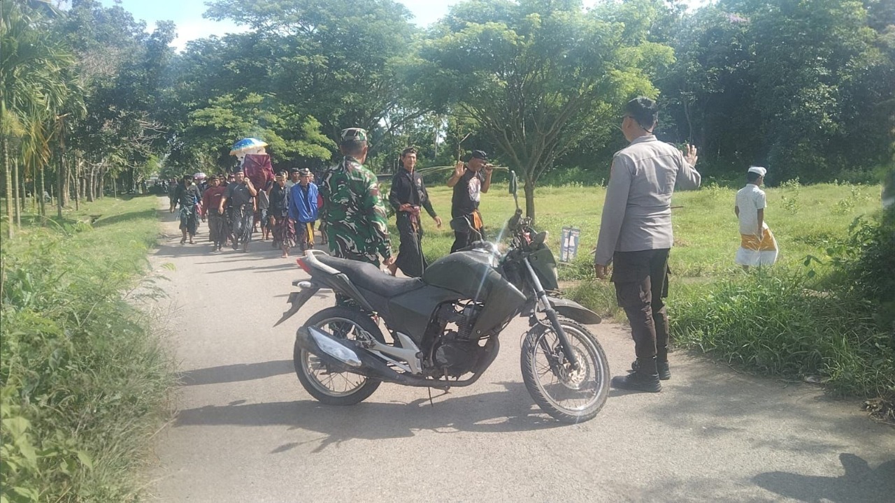 “Bhabinkamtibmas Brigpol Saparwadi Ario, S.H., bersama Babinsa Sertu M. Arifin, melaksanakan serangkaian pengawalan jenazah dari rumah duka menuju pemakaman umum umat Hindu di Desa Sukamaju untuk menjalani prosesi kremasi. Tidak hanya mengawal, petugas juga sigap melaksanakan pengaturan arus lalu lintas dan pengamanan di area pemakaman guna menjamin rasa aman dan kekhusyukan bagi keluarga serta pelayat.” tambah AKP Didik.