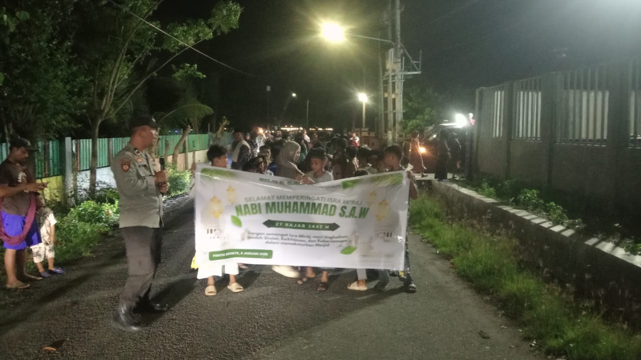 Sumbawa Barat – Bhabinkamtibmas Desa Benete, Kecamatan Maluk, Kabupaten Sumbawa Barat menghadiri kegiatan pawai sholawat dalam rangka memperingati Isra Mi’raj Nabi Muhammad SAW yang digelar oleh Takmir Masjid Al-Hijrah, Dusun Pantai, Desa Benete, pada Kamis malam, 08 Januari 2026, sekitar pukul 20.00 WITA.