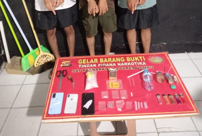 “Pengungkapan ini berawal dari informasi masyarakat yang kami tindaklanjuti secara cepat dan terukur. Dari hasil penggeledahan, kami berhasil mengamankan tiga terduga pelaku beserta narkotika jenis sabu seberat bruto 1,70 gram dan sejumlah alat pendukung. Saat ini para terduga telah kami amankan di Mako Polres Dompu untuk proses penyidikan lebih lanjut,” tegas IPTU Rahmadun.