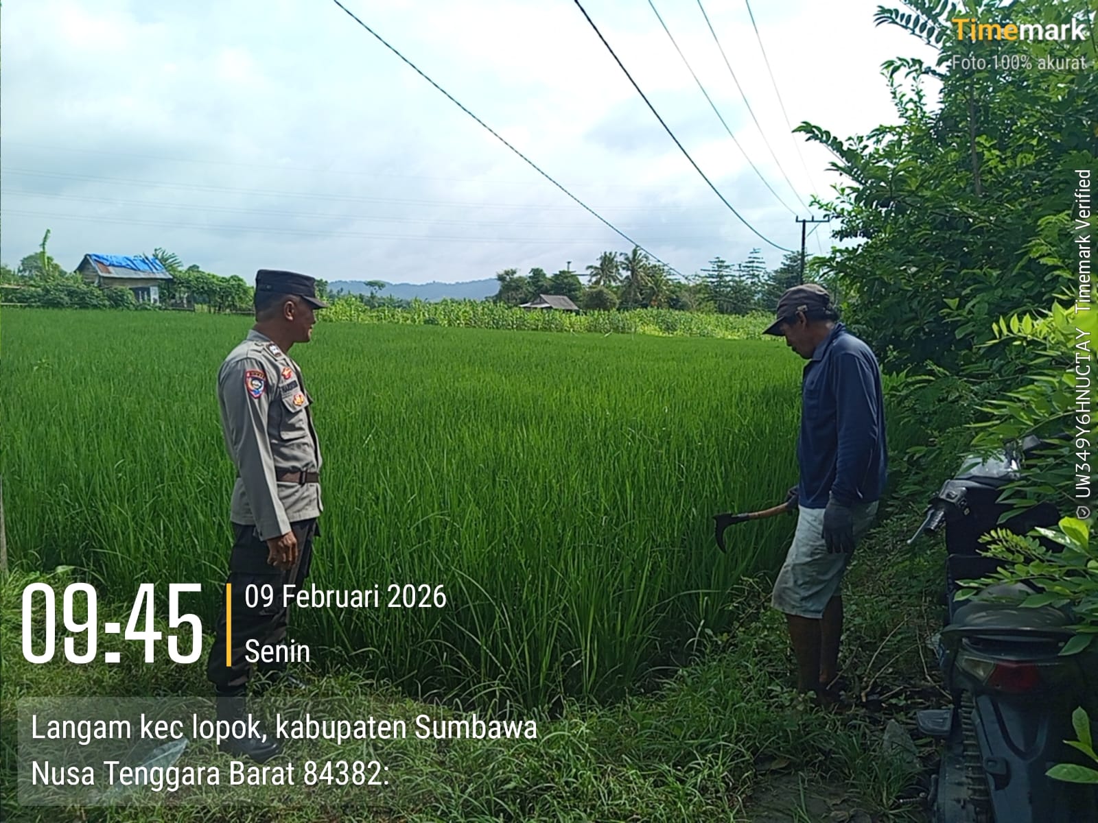 Sumbawa Besar, NTB — Personel Bhabinkamtibmas Polsek Lape jajaran Polres Sumbawa terus mengintensifkan kegiatan sambang desa guna memperkuat sinergitas dengan masyarakat agraris. Pada Senin pagi (09/02/2026) sekitar pukul 09.45 WITA, Bhabinkamtibmas Desa Langam, Aiptu Hardiyanto, melaksanakan patroli dialogis di kawasan pertanian Orong Sepang, Desa Langam, Kecamatan Lopok, Kabupaten Sumbawa.