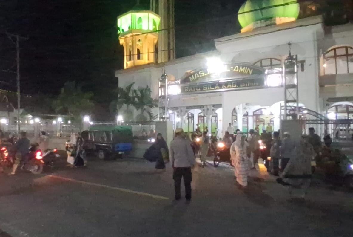 Anggota polsek bolo Polres Bima Polda NTB melaksanakan patroli pengamanan Sholat Taraweh bulan Ramadhan 1447 Hijriah tahun 2026 di Masjid Al Amin Desa Rato Kecamatan Bolo Kabupaten Bima.