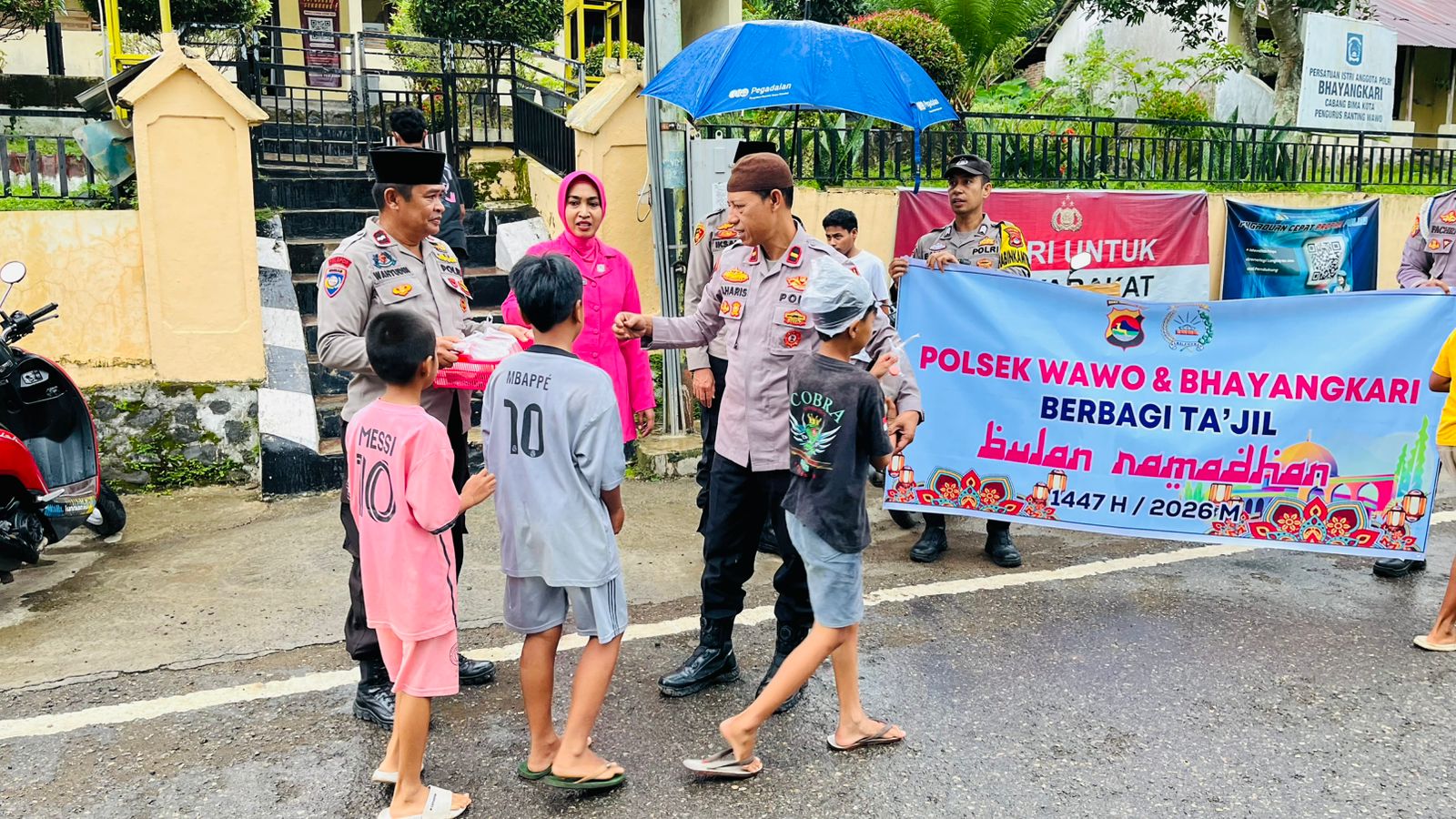 Kota Bima, NTB (24 Februari 2026) – Dalam semangat bulan suci Ramadhan 1447 Hijriah yang penuh berkah, jajaran Polsek Wawo Polres Bima Kota bersama Bhayangkari melaksanakan kegiatan berbagi takjil gratis kepada masyarakat dan para pengendara yang melintas di depan Mako Polsek Wawo, Senin (23/2/2026) sore.