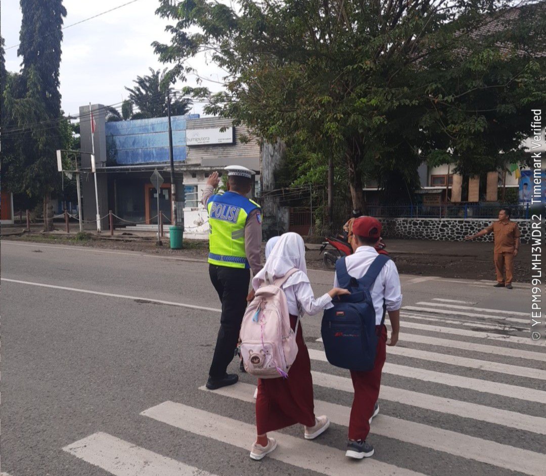 Selain melakukan pengaturan lalu lintas, personel Sat Lantas juga membantu menyeberangkan pejalan kaki, khususnya anak-anak sekolah, agar dapat menyeberang dengan aman serta memberikan rasa nyaman bagi pengguna jalan lainnya.