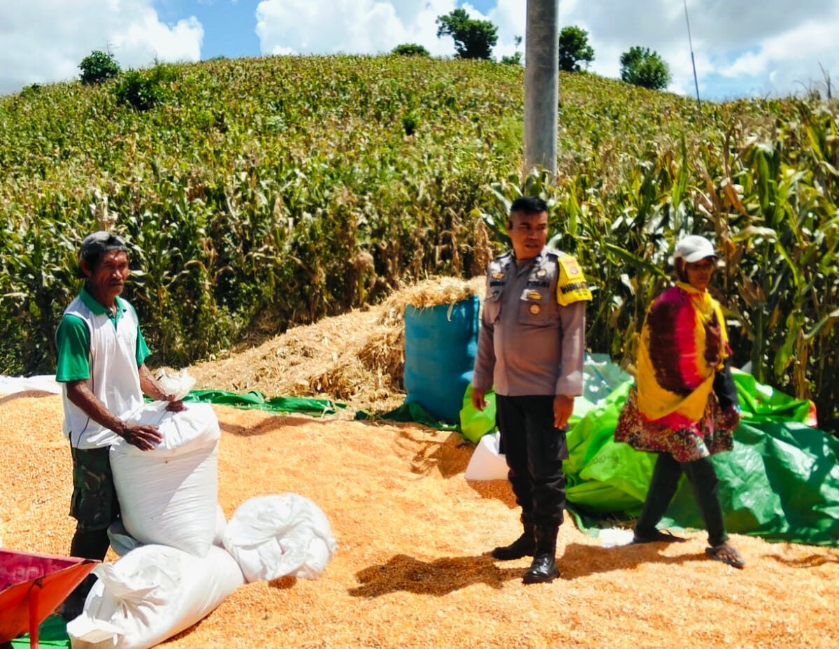 Dalam rangka mendukung Program Ketahanan Pangan Nasional menuju Indonesia Emas 2045, Bhabinkamtibmas Desa Matua Polsek Woja, AIPTU Wawan Dermawan, melaksanakan kegiatan pemantauan sekaligus membantu proses penjemuran dan pengemasan hasil panen jagung milik warga binaan, Kamis (19/3/2026) pukul 11.55 Wita hingga selesai.