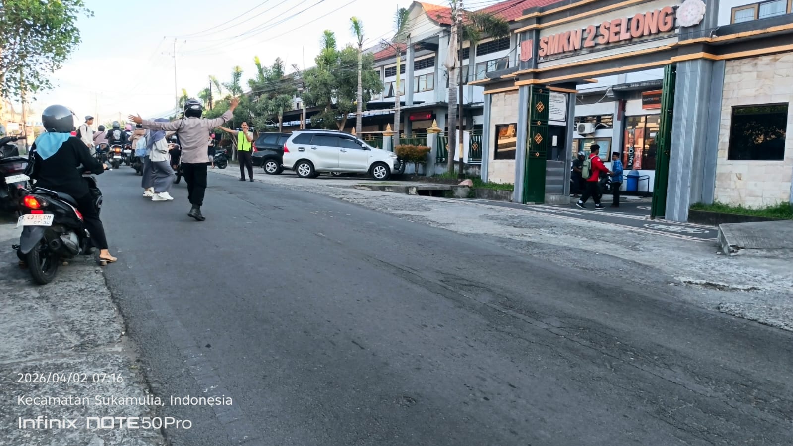Lombok Timur – Personel Polsek Sukamulia melaksanakan kegiatan pengaturan lalu lintas sebagai bentuk pelayanan kepada masyarakat di depan SMKN 2 Selong, Desa Sukamulia Timur, Kecamatan Sukamulia, Kabupaten Lombok Timur, Kamis (2/4/2026) pagi.
